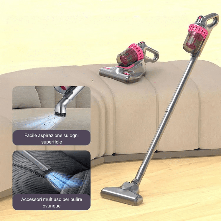 • Rimozione degli Acari, 8.000 vibrazioni/min per eliminare sporco nascosto da materassi e divani.