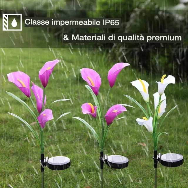Queste luci a energia solare sono progettate per resistere alle intemperie con una classe di impermeabilità IP65. I fiori e gli steli sono realizzati con materiali di alta qualità, in grado di sopportare pioggia, freddo e calore senza perdere la loro bellezza o sbiadire. Questi gigli solari sono perfetti per essere utilizzati tutto l’anno, in qualsiasi condizione atmosferica.