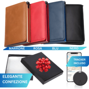 Portafoglio 3 in 1 che protegge, organizza e traccia. Con RFID blocker, tracker integrato e sistema leva-tutto per avere le carte sempre pronte e al sicuro.