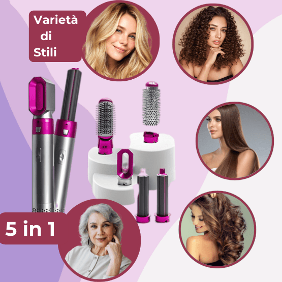 - Accessorio multifunzione con asciugacapelli ionico, testina volumizzante, testina per ricci e spazzola lisciante.